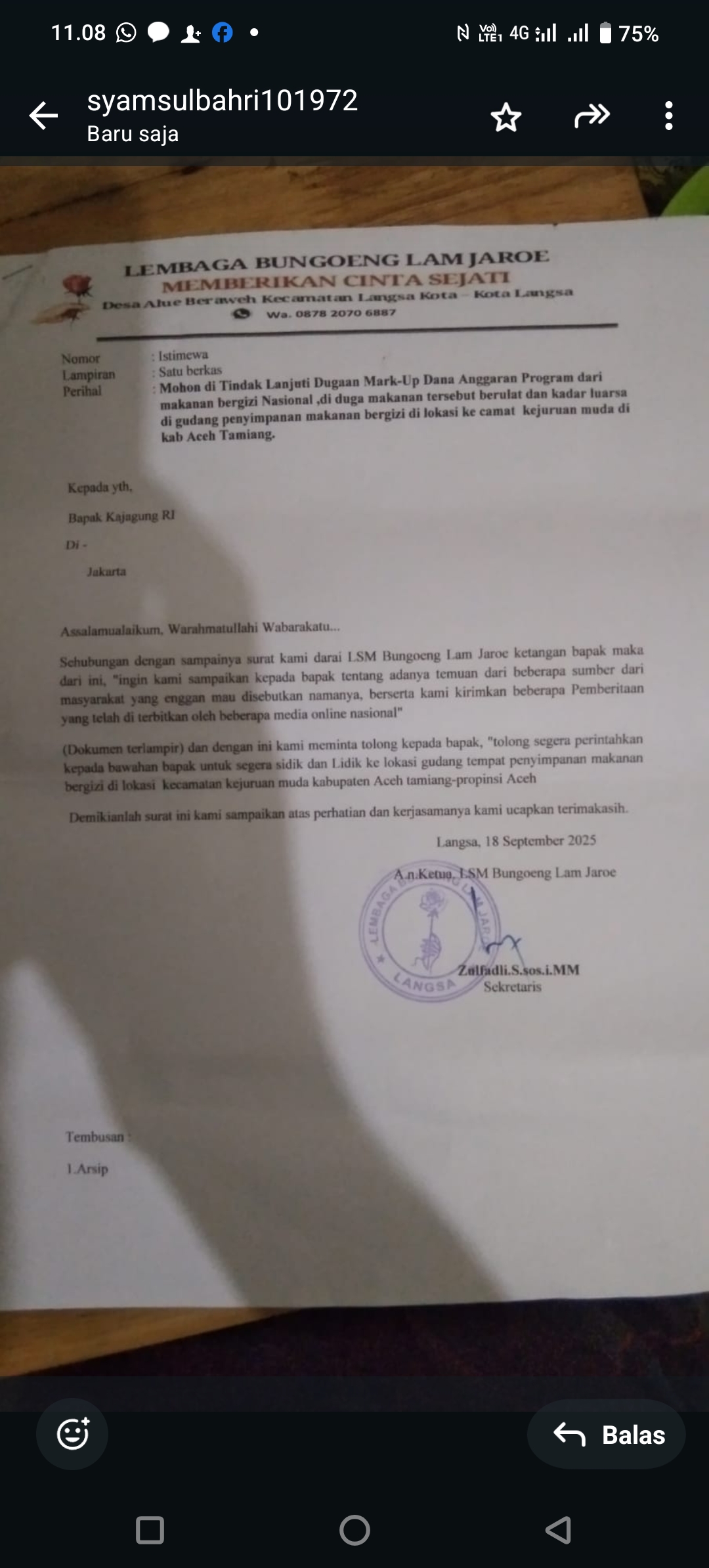 Ada pun, layangan surat (dokumen) yang telah di terbangkan. Melalui jasa pengiriman barang (J&T), di daerah kota langsa provinsi aceh itu. Sesuai dokumen (surat) lsm bungoeng lam jaroe aceh, yang telah di berikan oleh bung “zulfadli” tersebut. Dengan isi yang tertuliskan, dalam dokumen itu. Nomor, istimewa aceh. Lampiran, satu berkas. Perihal, mohon di tindak lanjuti. Dugaan mark-up dana anggaran, program dari makanan bergizi nasional. Diduga makanan tersebut, berulat dan kadaluarsa. Di gudang penyimpanan makanan bergizi, di lokasi kecamatan kejuruan muda kabupaten aceh tamiang.