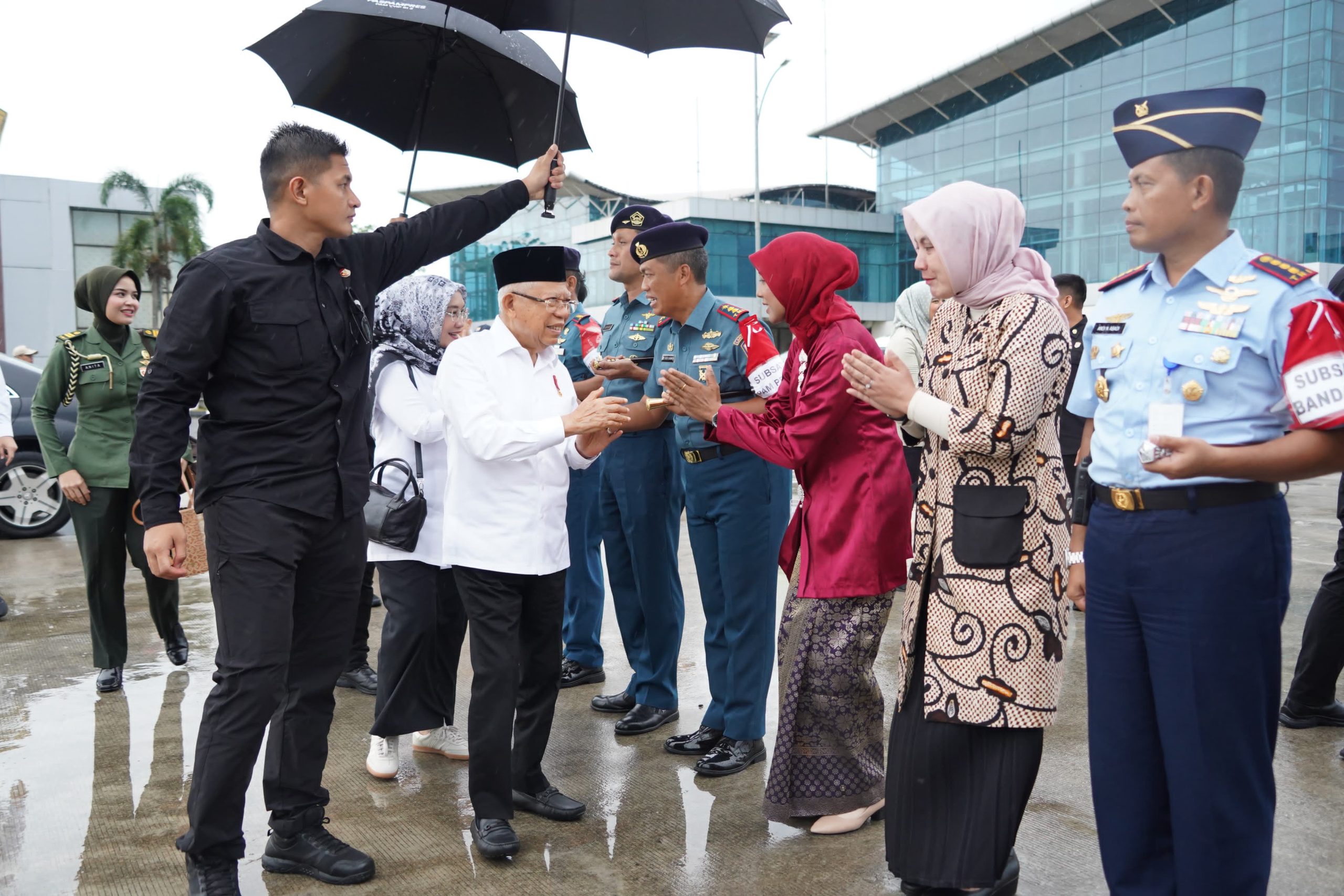 Kedatangan Wakil Presiden RI beserta rombingan disambut oleh Gubernur Kepri Ansar Ahmad, S.E., M.M. beserta Istri, Kapolda Kepri Irjen Pol Drs. Yan Fitri H, Kabinda Kepri Brigjen TNI Bonar Panjaitan, S.E., M.Si., Danrem 033/WP Brigjen TNI Jimmy Watuseke, KS. Koarmada I, Danguspurla Koarmada I Laksamana Pertama TNI Mohammad Taufik, M.MDS., Danlanud RHF Kolonel Pnb Andi Nur Abadi, Danlanudal Tanjungpinang Kolonel Laut (P) Sahid Hamdani, S.H., Danwing Udara I Kolonel Laut (P) Gugus Wahyu, S.U., S.H., M.Tr. Hanla., M.M., Danlanal Bintan Letkol Laut (P) Eko Agus Susanto, S.E., M.M., Bakamla Kazona Barat Kolonel Bakamla Tuyatman, S.H.,M.H., Ketua Pengadilan Tinggi Agama Provinsi Kepri diwakili Wakili Ketua Dr. Drs. H. Dalih Effendy, S.H., M.Esy, Kajati Kepri Teguh Subroto, Kepala Dinkes Provinsi Kepri M. Bisri, Kepala Dishub Provinsi Kepri Junaidi, Kepala Satpol-PP Provinsi Kepri Hendri Kurniadi, S.STP.