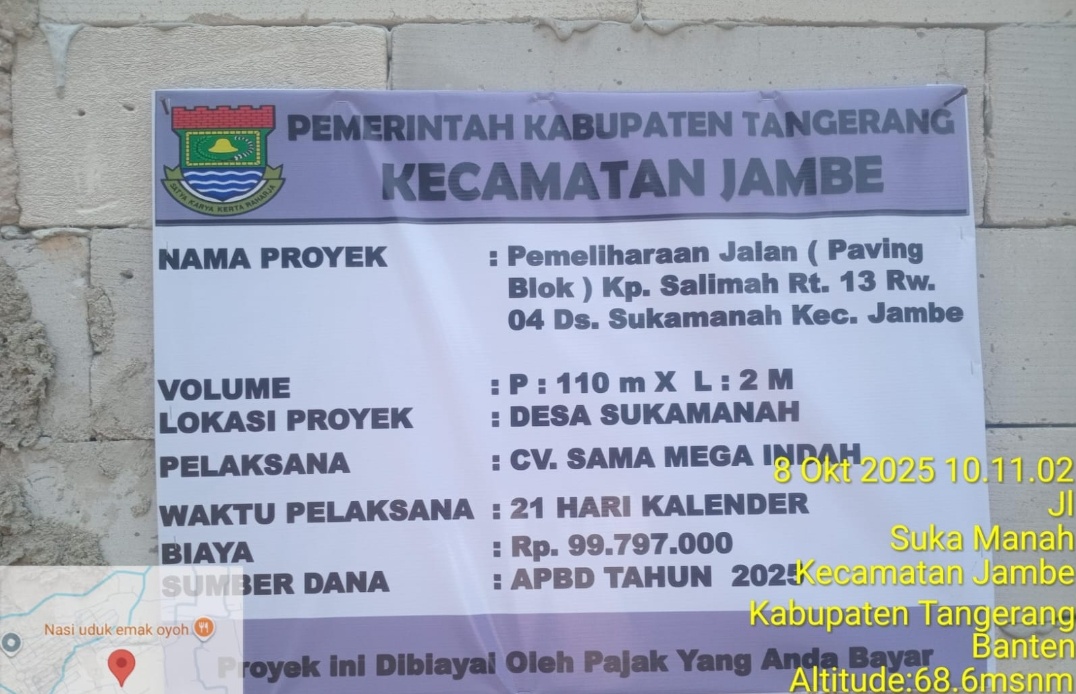 Kabupaten Tangerang, Swaragemati.id-Pemerintah Desa Sukamanah Kecamatan jambe Kabupaten Tangerang, terus mengakselerasi pembangunan infrastruktur demi meningkatkan kenyamanan dan kesejahteraan masyarakat. Salah satu program prioritas yang kini tengah. direalisasikan adalah pembangunan jalan lingkungan dengan sistem paving block, yang bersumber dari Anggaran Pendapatan (APBD) Tahun Anggaran 2025.
