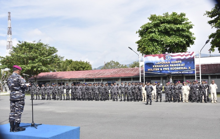 TNI AL, Jayapura, Swaragemati.id – Suasana haru dan kebanggaan menyelimuti Lapangan Apel Komando Daerah Angkatan Laut (Kodaeral) X pagi itu. Dibawah sinar matahari yang lembut, 33 prajurit menerima kenaikan pangkat, sementara 41 personel lainnya merayakan hari ulang tahun mereka bersama Keluarga Besar Kodaeral X. Momen istimewa ini dipimpin langsung oleh Komandan Kodaeral X Mayjen TNI (Mar) Werijon, M.Han., CIQnR., CIQaR., dalam Upacara Laporan Korps Kenaikan Pangkat Kala Waktu 1 Oktober 2025 yang dirangkaikan dengan perayaan ulang tahun personel dibulan Oktober, Jumat (10/10/2025).