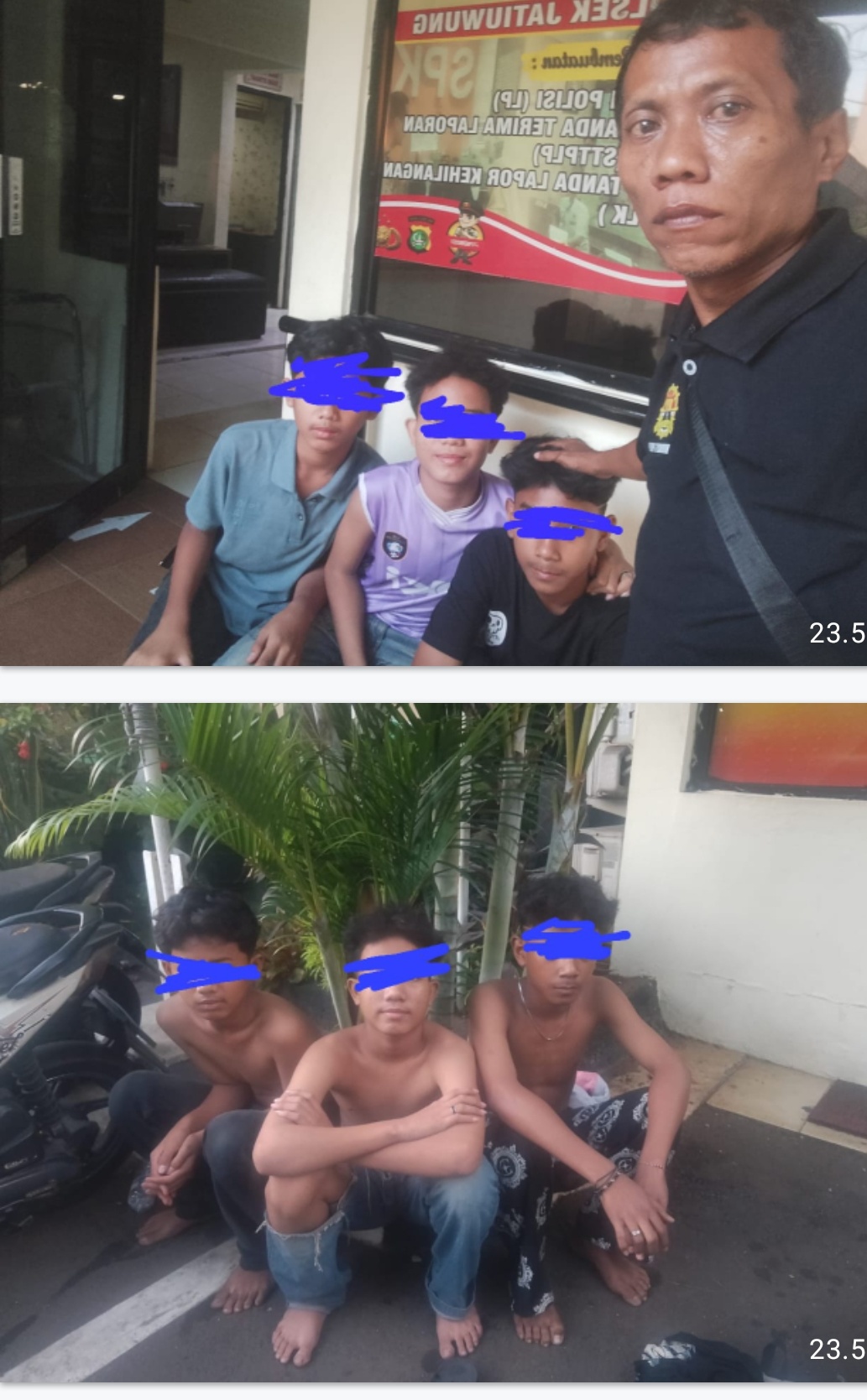 Alhasil dari observasi di TKP, Petugas bersama tim Kalong Pokdar Kamtibmas berhasil mengamankan 3 remaja berstatus masih Pelajar berinisial RI (14th), I’M (14th), TI (14th) berikut BB 1 unit sepeda motor jenis matic Honda beat warna biru bernopol B 3961 CLC dan 1 bh Handphone merk infinix smart 9 dan membawa ketiga remaja tersebut ke Mako Polsek Jatiuwung untuk dilakukan pendataan, pemeriksaan, pembinaan serta pemanggilan para orangtua Guru sekolah RT /RW.