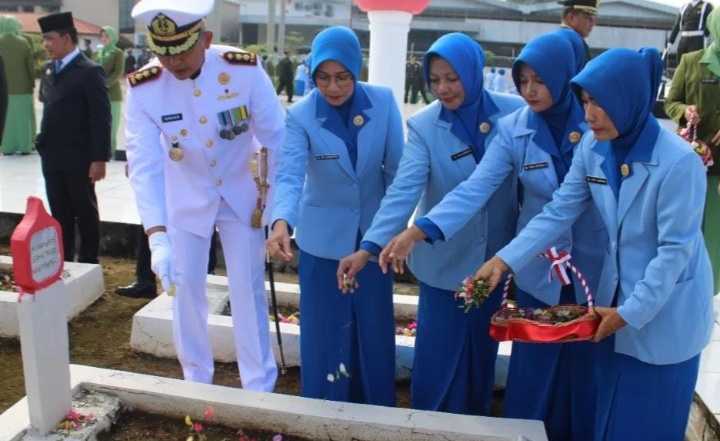TNI AL, Bengkulu, Swaragemati.id – Komandan Pangkalan TNI Angkatan Laut (Danlanal) Bengkulu Letkol Laut (P) Nurwahidin, S.H., M.Tr.Opsla., didampingi Ketua Cabang 4 Daerah Kodaeral II GJKRI Ny. Nurcahyani Nurwahidin menghadiri Upacara Ziarah Nasional dalam rangka memperingati Hari Ulang Tahun (HUT) Ke-80 Tentara Nasional Indonesia (TNI) dengan tema ” TNI Prima, TNI Rakyat, Indonesia Maju”, bertempat di TMP Balai Buntar, Jalan Adam Malik, Kelurahan Pagar Dewa, Kecamatan Selebar, Kota Bengkulu, Jum’at (03/10/2025).