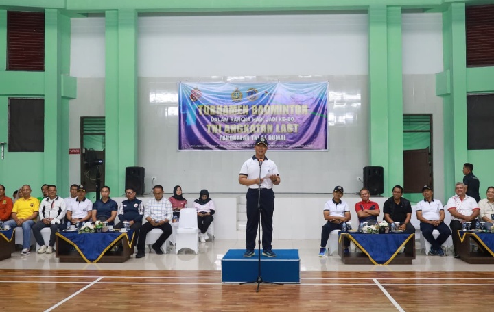 TNI AL, Dumai, Swaragemati.id – Sportivitas dan euforia kebersamaan begitu terasa pada penutupan Turnamen Badminton dalam rangka memperingati Hari Jadi Ke-80 TNI Angkatan Laut Tahun 2025. Acara puncak berlangsung meriah di GOR Bulu Tangkis Pertamina RU II Dumai, Komplek PT. Pertamina Refinery Unit II, Kelurahan Bukit Datuk, Kecamatan Dumai Selatan, pada Kamis malam (25/09/2025).